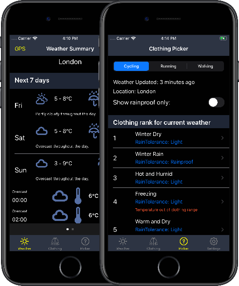 Active Weather is a fully fledged weather app which also stores clothing for running, walking and cycling - ranking the most appropriate clothing for the current weather.
