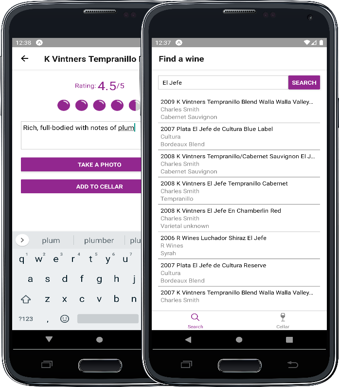 Grapes allows you to search for wines by name, winery, type, etc and see details for each result. Wines can be added to your collection with a rating, tasting notes and a photo.