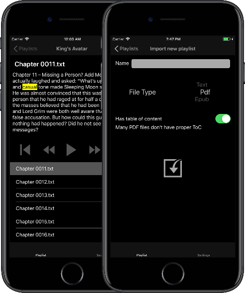 Read4me provides the opportunity to listen to the imported Text, PDF and Epub file. This app will automatically split files into chapters after importing. You can adjust number of words in pages that suit you best. The app will hilight the text while you are listening. You can go to bed while listening to the app with stop timer feature.